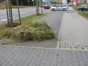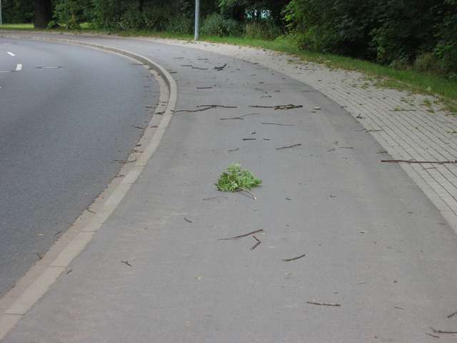 ♦ Nach einem Sturm. Bremsen oder schnell durch die Kurve - lebensgefährlich. Man beachte: Die Fahrbahn ist sauber.