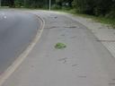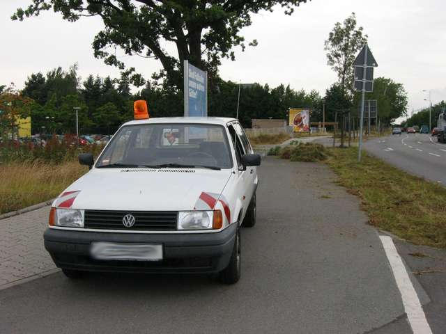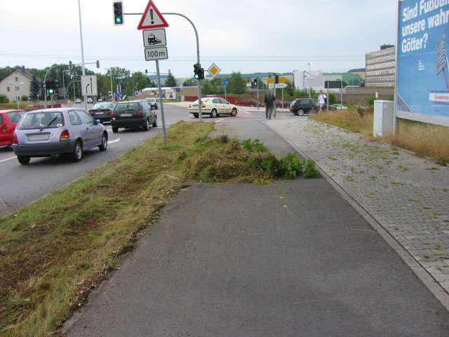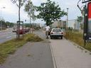♦ Auf der Fahrbahn zu fahren ist verboten. Keine Ahnung, wieso. Einen Radweg gibt es keinen. Nur einen (für Schrittgeschwindigkeit!) freigegebenen Fußweg, der nach nur 200m mitten in einer Haltestelle endet.
