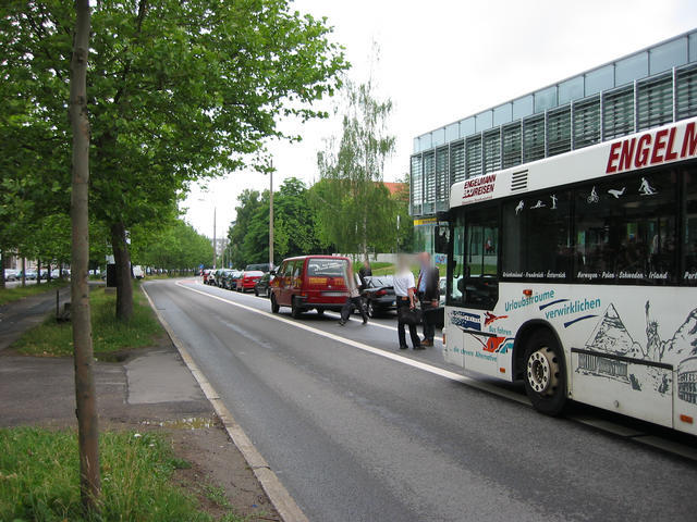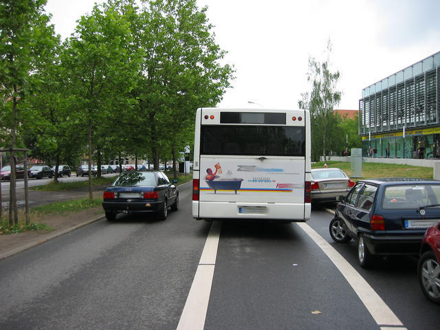 ♦ Da ist wohl jemandem der Bus aus der Hand gefallen. Für einen kleine Schwatz ganz gewiss eine gute Stelle. (Nein. In Wirklichkeit war eine Reisegruppe beim Einsteigen. Um die Ecke wäre ein großer Parkplatz gewesen.)