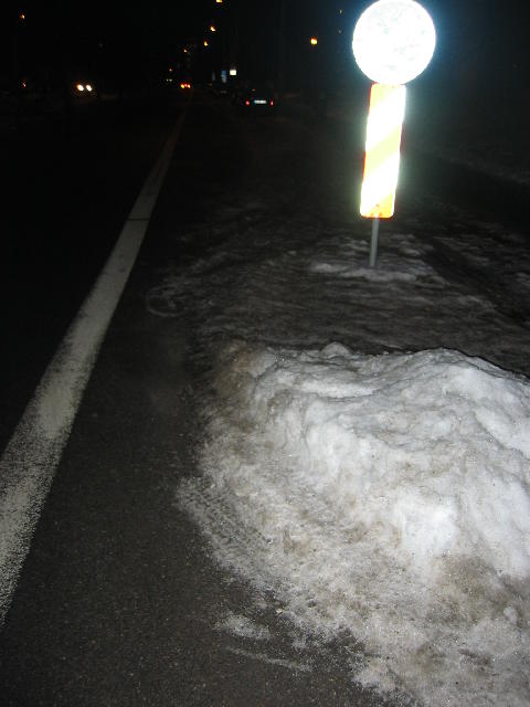 ♦ IRRTUM: Es ist soweit. Ein neuer 200-m-Rad-Weg. Direkt neben einer über 4 m breiten und leicht abschüssigen Fahrbahn. Derjenige, der das Schild befestigt hat, muss sich vor Lachen gekugelt haben. Ja! Der Radweg ist links unter dem Schnee versteckt.