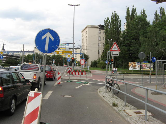 Auf der Zusatztafel steht übrigens 'Taxi und Radfahrer frei'. Woher man den Spruch hat und was der bedeuten soll, ist mir nicht klar. Rechts wird gebaut. Da gibt es keine Fahrbahn mehr. Nach links über eine zweispurige Fahrbahn abbiegen will man da auch nicht. Selbst vorher war das direkte Linksabbiegen hier nur Taxen erlaubt. Indirektes Abbiegen ist an dieser Kreuzung sowieso erlaubt, wenn nicht sogar per 'Radverkehrsführung' vorgeschrieben (man beachte das kleine gelbe Schild nach der Kreuzung).