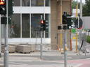 ♦ Da kommt sicher kein Auto. Aber auch wenn der Radweg von 'hinten' gesperrt ist, so können laut Warnschild trotzdem da Radfahrer entlang wollen. Trotzdem zeigt die Ampel tapfer rot. Ob sich da jemand dran hält?