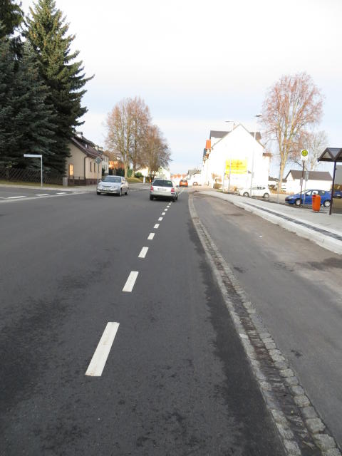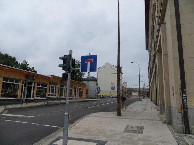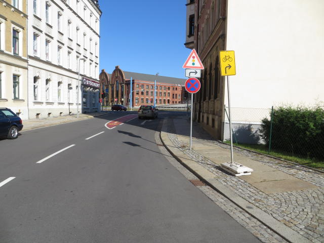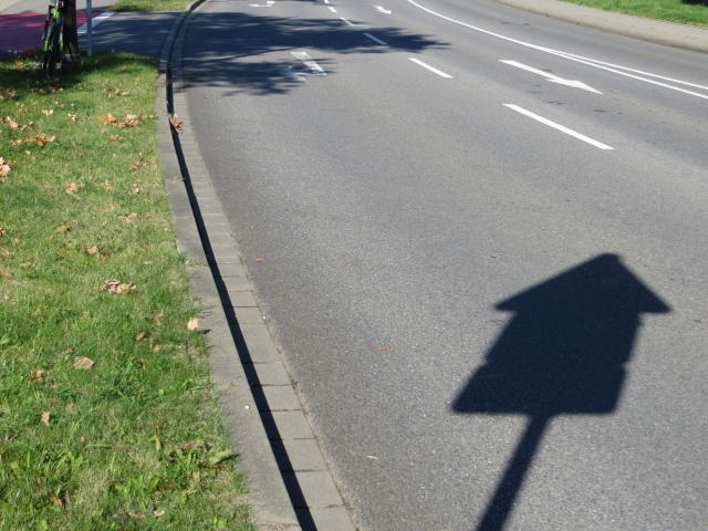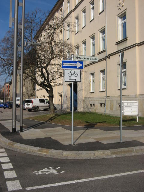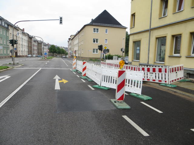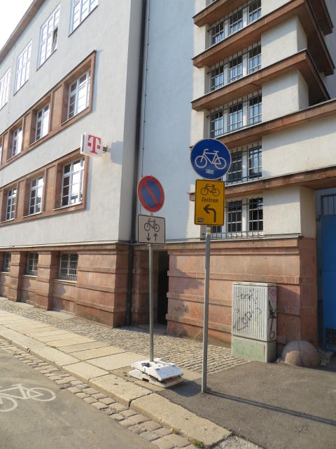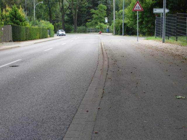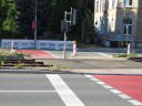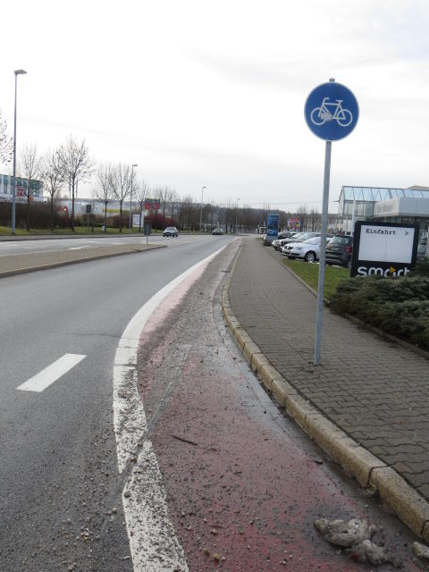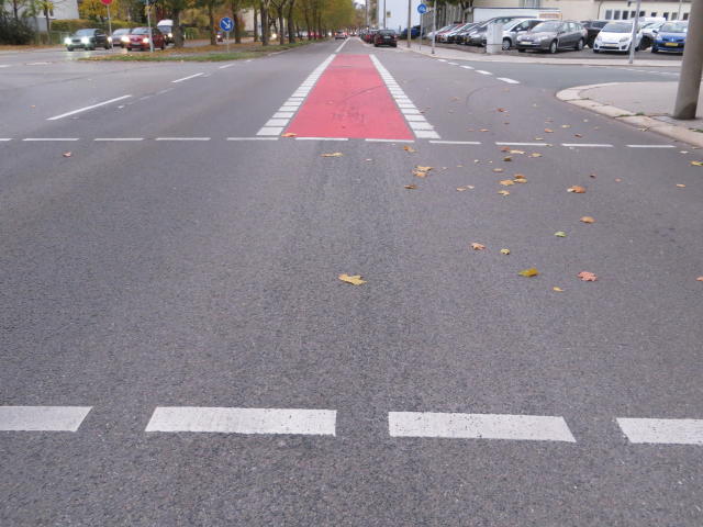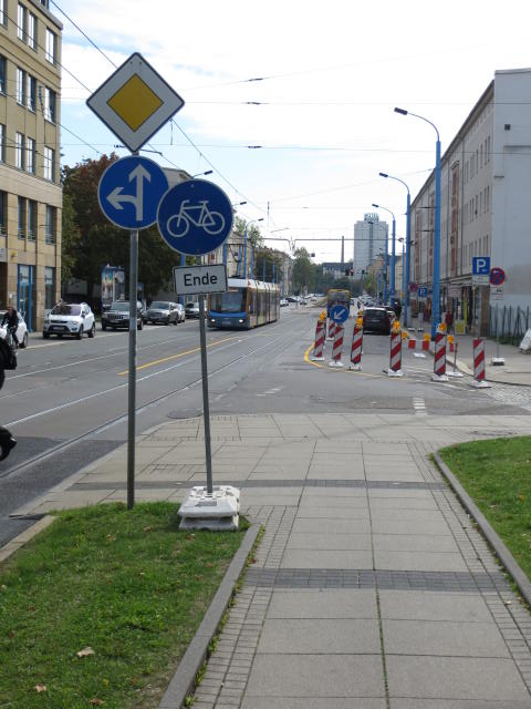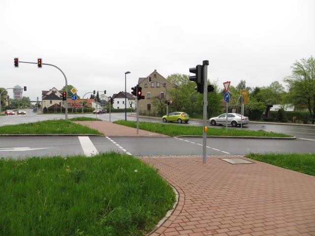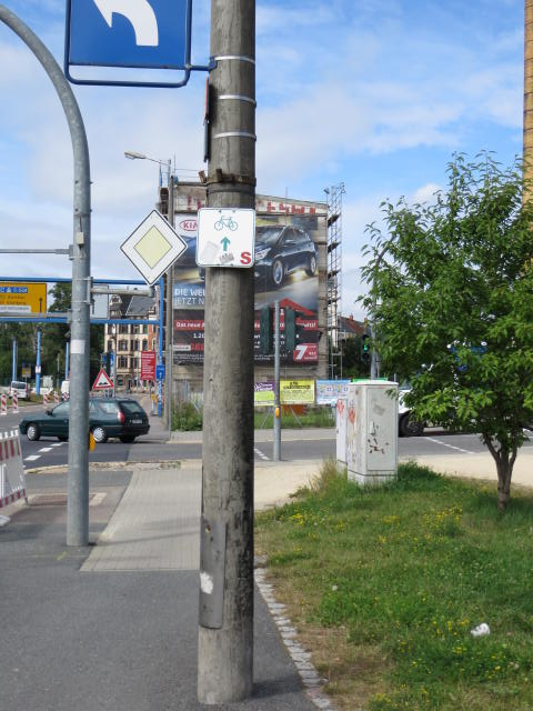 ♦ Eigentlich war ja von 'Neugestaltung' gesprochen worden. Aber nur mal so zum Nachdenken... Wenn man 'gerade aus' will, dann geht das nicht etwa gerade aus. Nein, man muss erst bis zu diesem Radwegschild da links.