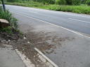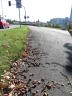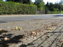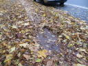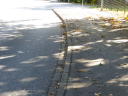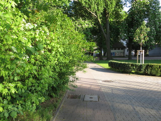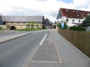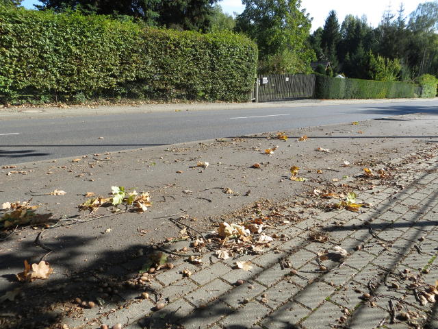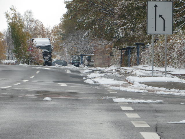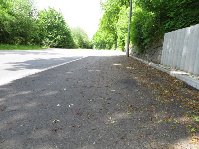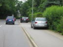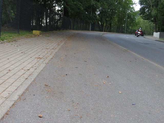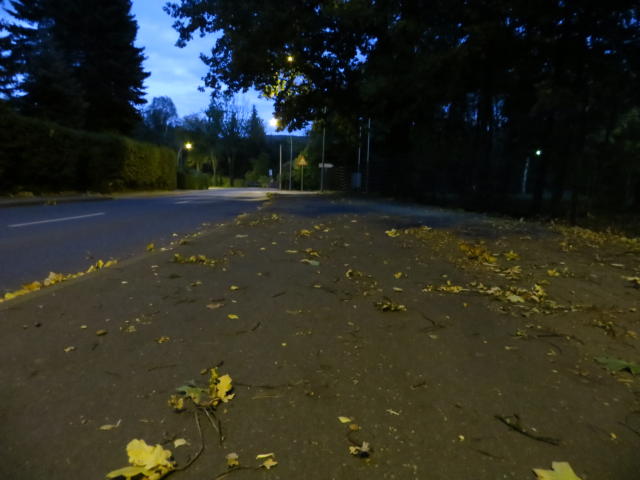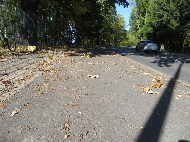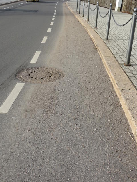 ♦ Besonders pikant: Genau in der Spitze des Winkels (Kurve kann man das nicht nennen), ist - mal wieder - eine Schachtabdeckung aus Metall. Bei Nässe und/oder mit Dreck wird die glatt!!!
