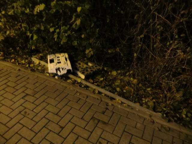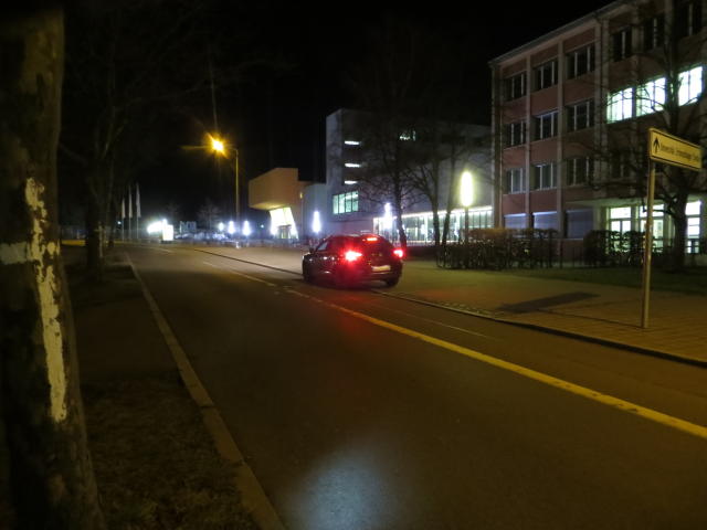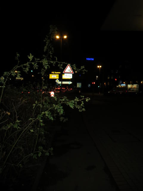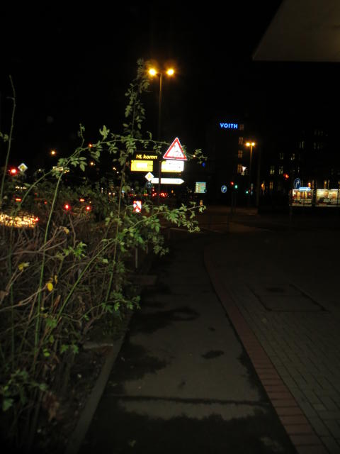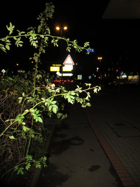 ♦ Die Triebe der Rosen-Hecke sind nur schwer zu erkennen. Die Kamera kann verschiedene Belichtungen, hat einen Blitz und sogar einen speziellen Nachtmodus zum Aufhellen. Der Radfahrer hat nur das normale Fahrradlicht und das beleuchtet eher nur spärlich den Boden. Es tut echt weh, wenn man so einen Zweig mit Dornen ins Gesicht oder gar ins Auge bekommt.