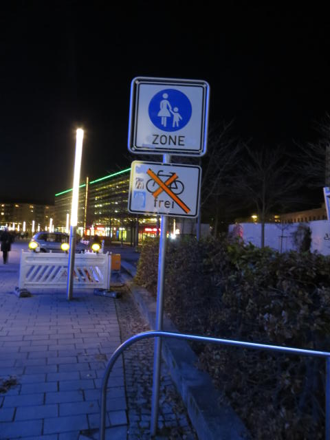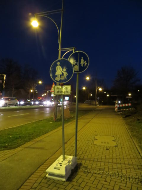 ♦ Wie soll man das jetzt verstehen? Weiter auf der Fahrbahn? Verkehrszeichen stehen ja gewöhnlich rechts. Oder gibt es hier keinen Gehweg mehr? Aber dann macht ja das dritte Zeichen keinen Sinn.