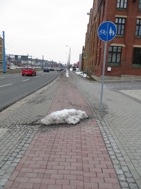 ♦ Das ging ja schnell mit dem Ersatzschild. Wenn man nur so fleißg wäre, den Radweg auch benutzbar zu halten... ob das denn keiner seltsam findet, die einzige Eisfläche der gesamten Straße mit Benutzungspflicht zu versehen?