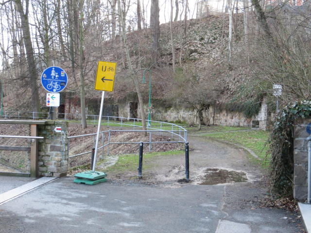 ♦ Gegenüber die kleine Rampe hochzufahren, wurde wohl schon des öfteren von der Polizei angemahnt. Statt dessen soll man hier rechtsseitig fahren und dann vorn die Ampel nutzen.