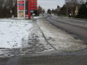 ♦ Typsiche Wintersituation: Fahrbahn frei, Radweg nahezu komplett mit Schneematsch bedeckt. Dank des Radweges ist die Fahrbahn aber so schmal geworden, dass man als Radfahrer kaum legal von Autos überholt werden kann.
