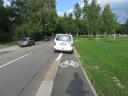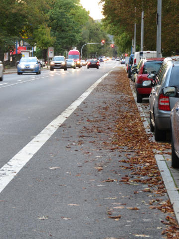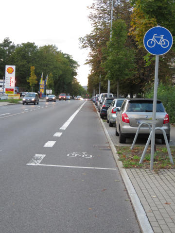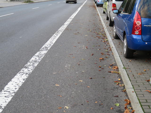 ♦ Das hier wäre sogar benutzungspflichtig. Aber man kann sicher auch auf der zweiten Fahrspur geradeaus fahren. Oder eben einen Dooring-Unfall riskieren.