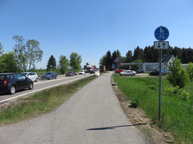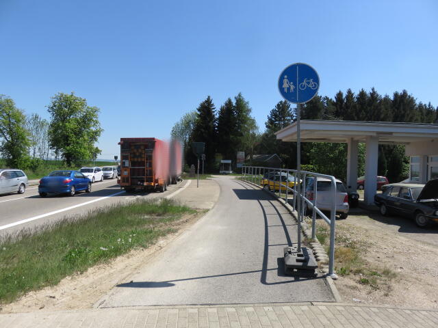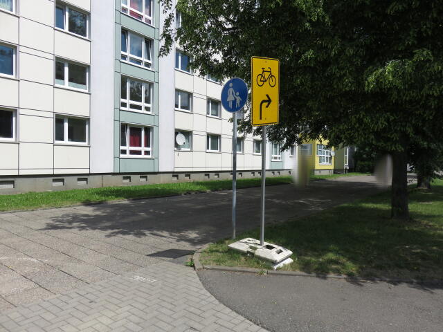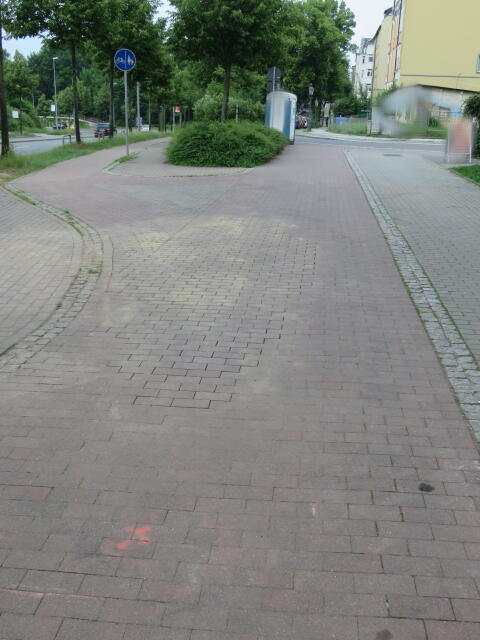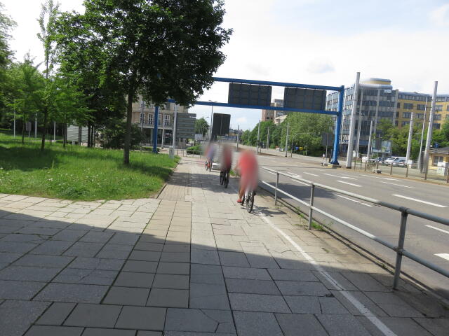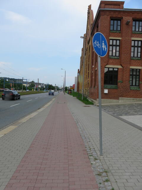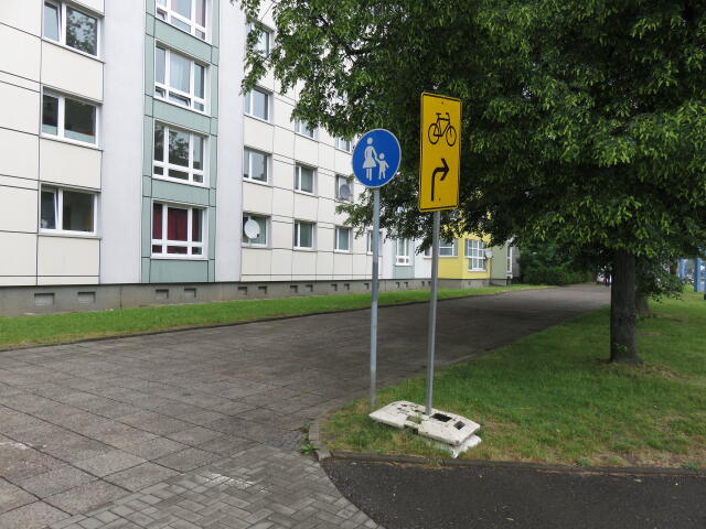 ♦ Da bleibt auch nichts anderes übrig, als die Fahrbahn zu fahren. Dabei war das hier sooo gefährlich, dass man sogar einen gemeinsamen Geh-Rad-Weg angelegt hat. Hätte man auch 'ne Auffahrt oder wenigstens Tempo 30 machen können.