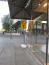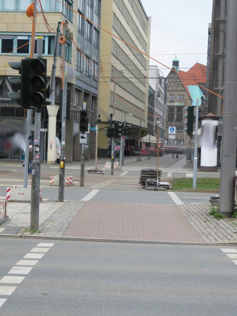 Nun gibt es eine neue Ampel direkt am Anfang der Busspur. Die ist aktuell Grün (die hintere). Aber die erste Fußgänger-Ampel ist rot. Also warten.