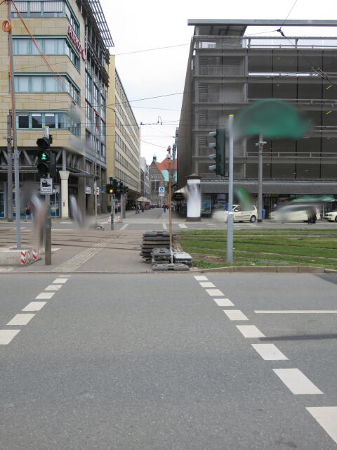 ♦ Das wäre der Weg zum Bahnhof. Vor dem Tietz darf man nicht auf der Bahnhofstraße fahren, weil da die Zenti ist. Also muss man eigentlich hier gerade aus. Eigentlich. (Das Auto scheint es allerdings nicht zu stören...)
