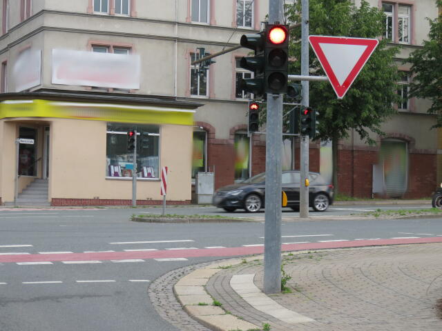 ♦ In Gegenrichung ähnlich. Die erste Fußgänger-Ampel ist grün. Aber die Radampel ist rot. Also warten.