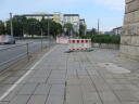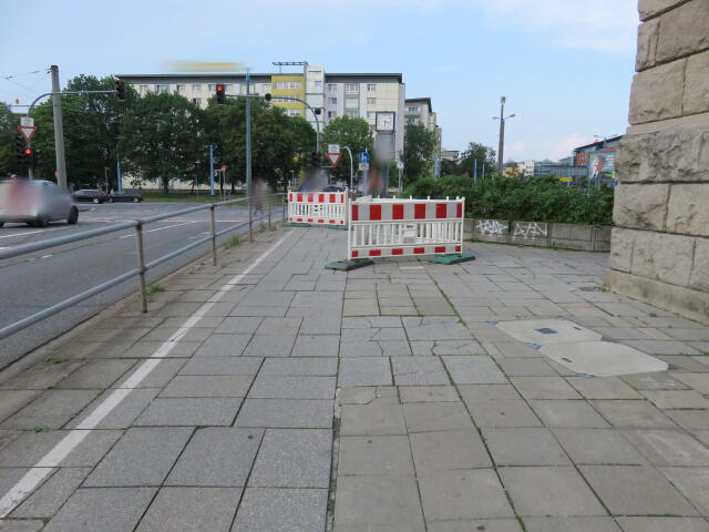 ♦ Man dieht es dieser Stelle nicht an, aber da ist ein getrennter Geh-/Radweg. Und nein, der Radwegteil soll eigentlich nicht zwischen Geländer und Linie sein, sondern irgendwo rechts der Linie. Mit viel Fantasie erahnt man noch ein wenig Farbe links der Schachtdeckel. Aber nun stehen hier erstmal Absperrungen.