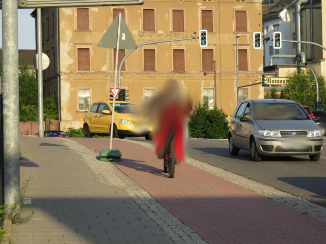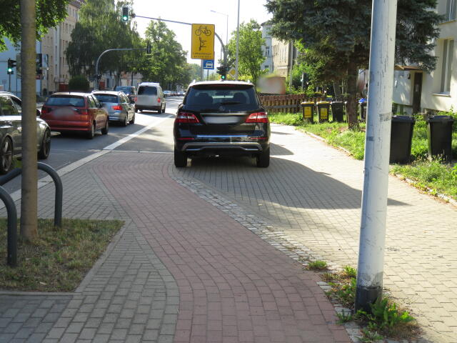 ♦ Und hier sogar eine (rein rechtlich) illegale Gehweg-Radlerei, weil das Schild falsch hängt.