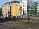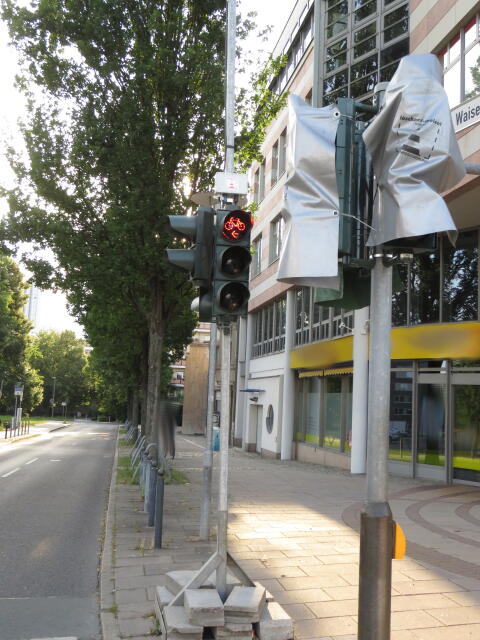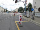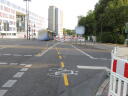 ♦ Mal wieder was neues. Man beachte auch, dass die fixe Ampel eine extra Signalisierung für das Abbiegen (zum Schutz der Radfahrer) hat. Die hat die Behelfsampel nicht.