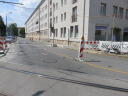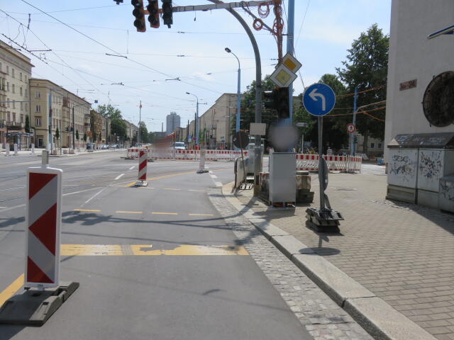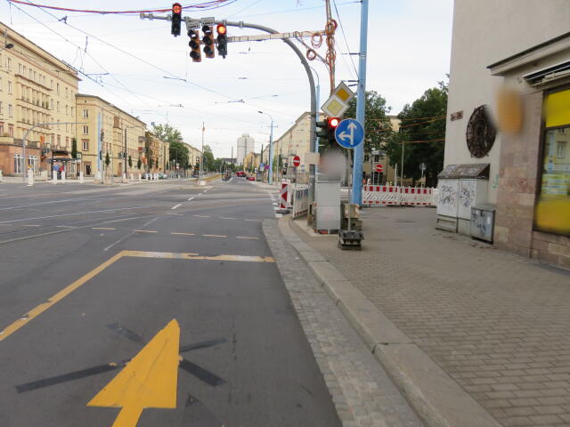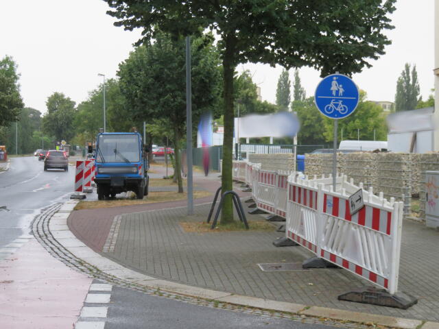 ♦ Interessant. Normalerweise ist da kein Radweg. (Also zumindest nicht mit Blauschild.) Jetzt ist Baustelle und man darf (muss) sich sogar noch mit Fußgängern um den Platz streiten.