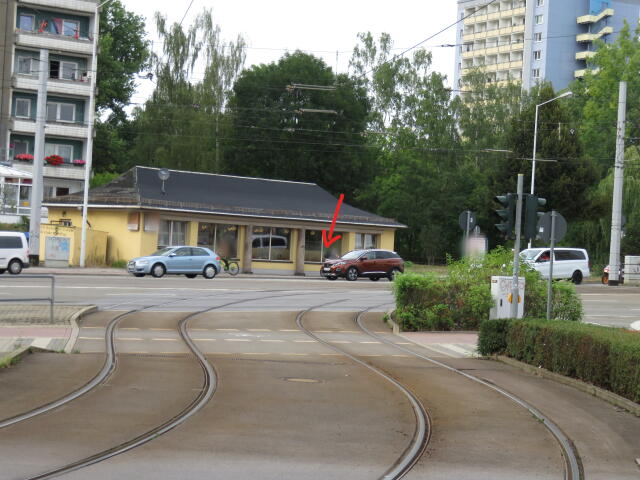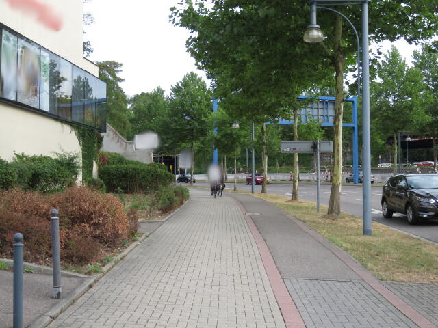 ♦ Dafür gibt es hier einen neuen Radstreifen, in Mindestbreite versteht sich. D.h. Überholen langsamer Mitradfahrender praktisch ausgeschlossen. Dafür mit einer großen Einfahrt ins Parkhaus (toter Winkel grüßt).