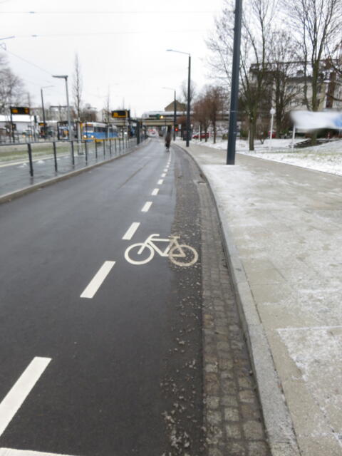 ♦ Noch ist nicht so viel Schnee. Aber das mit den schwarzen Pollern wird wahrscheinlich zum Problem, wenn man hier ordentlich räumen will. Als Radfahrer muss man hier auf die Fahrbahn.