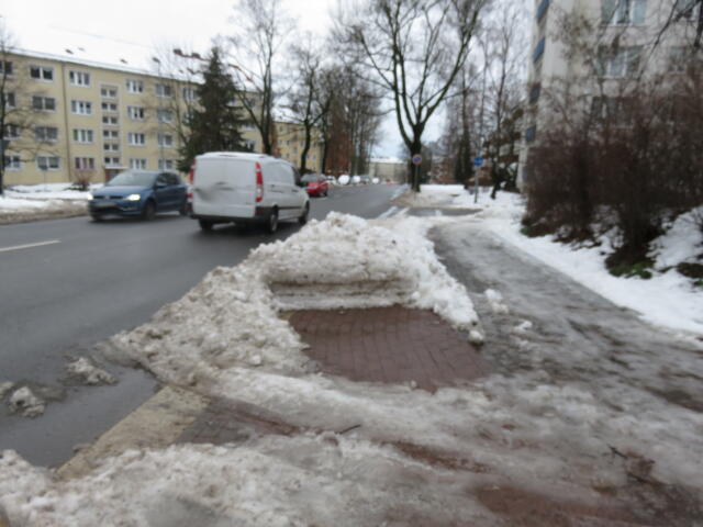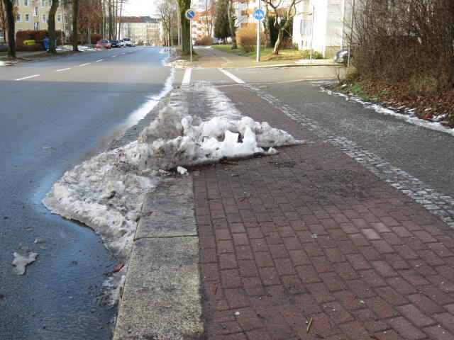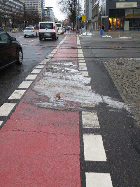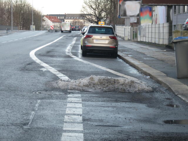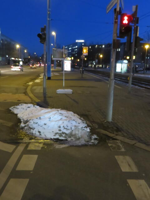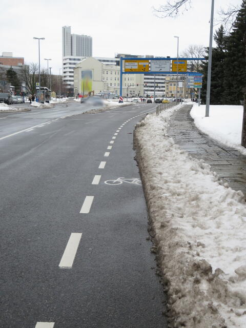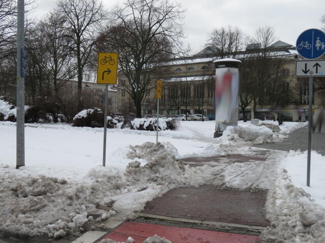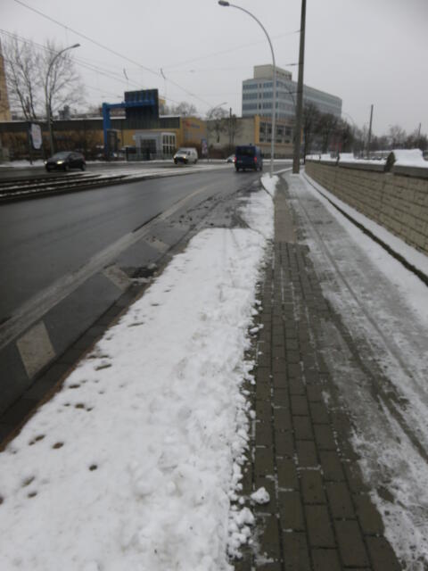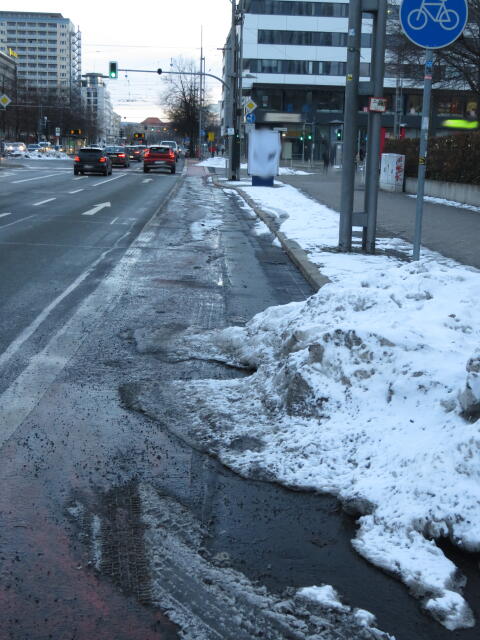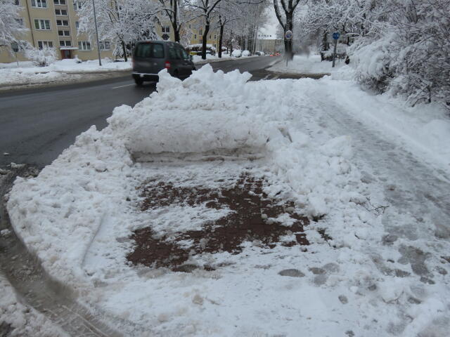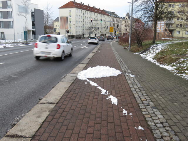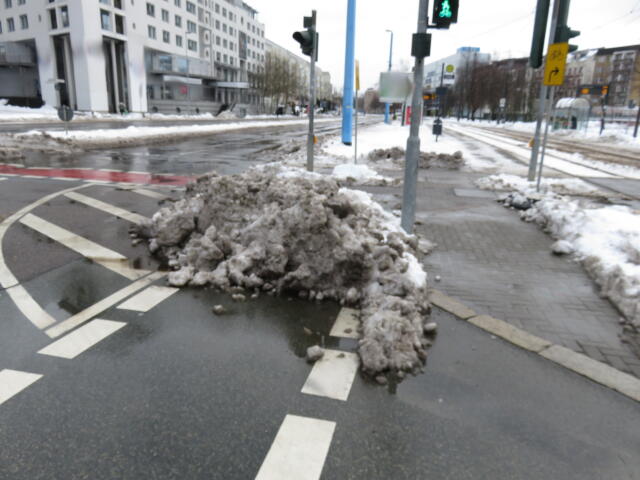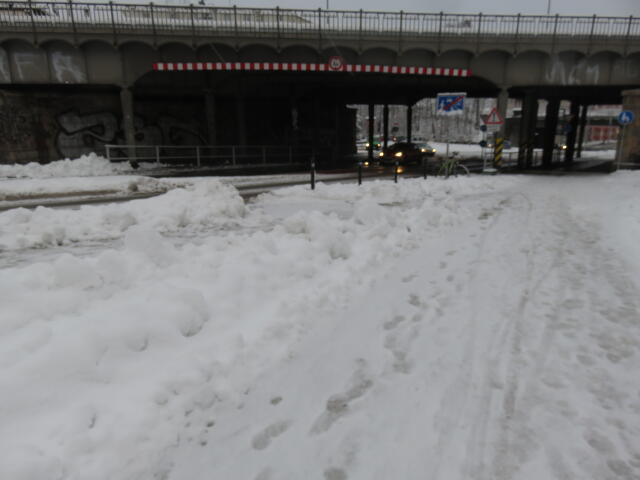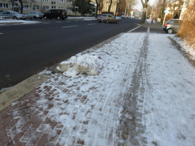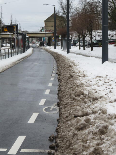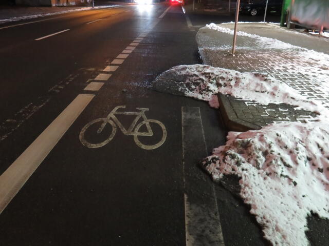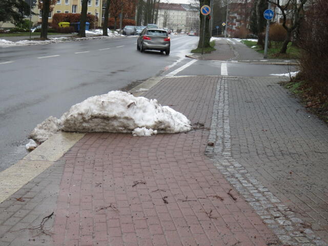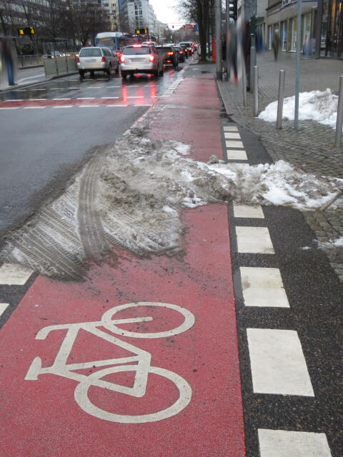 ♦ Auch hier geschickt den Schnee auf den Radweg geschoben. Kommt man gar nicht auf den verschneiten Sch(m)utzstreifen.