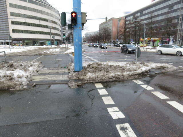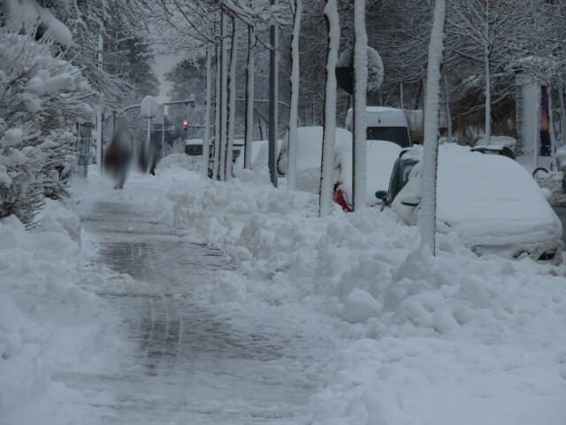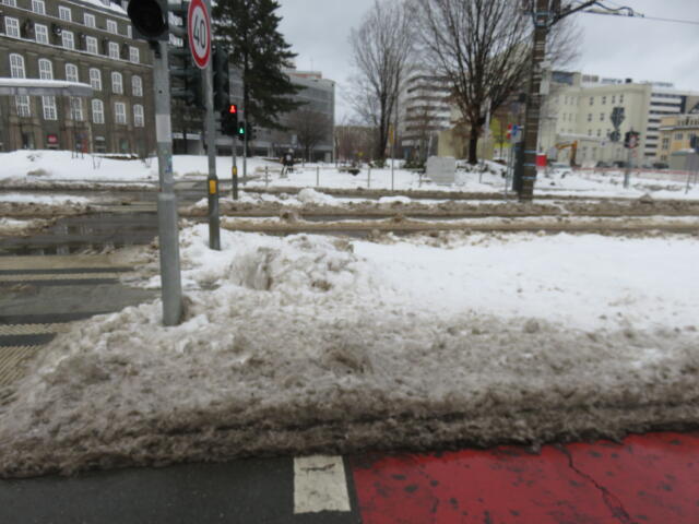 ♦ Zur Uni müsste man nun nach links. Doof nur, dass man mitten auf der Fahrbahn nun absteigen muss, um irgendwie durch den Schnee zu kommen.