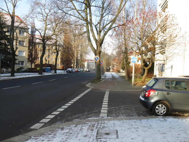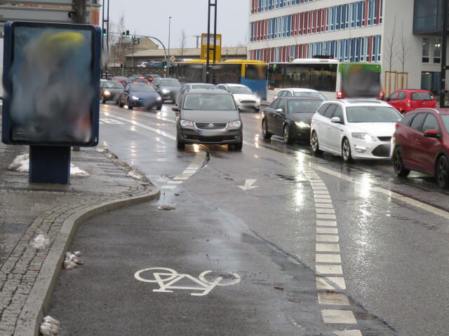 ♦ Als Radfahrer muss man nun neben den parkenden Autos auf der Fahrbahn fahren. Hoffentlich erkennt man das rechtzeitig. Sonst wird das hier etwas eng.