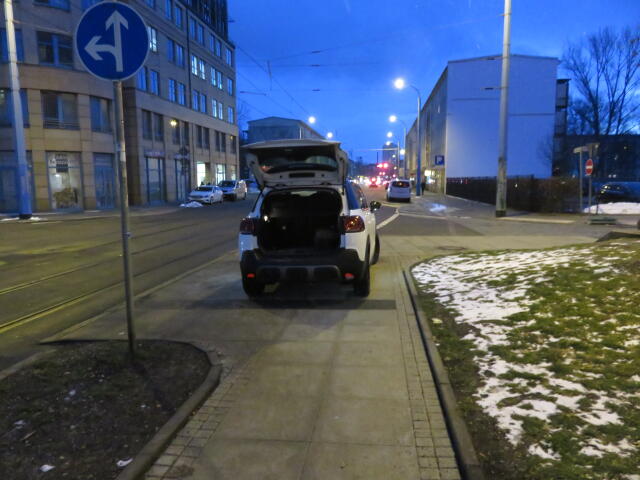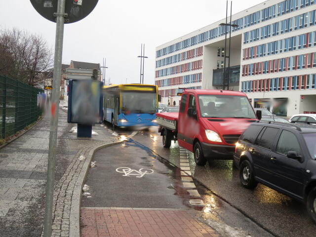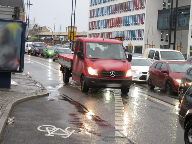♦ Natürlich steht der auf dem Radweg. Wo sonst? Auf der Fahrbahn vielleicht?
