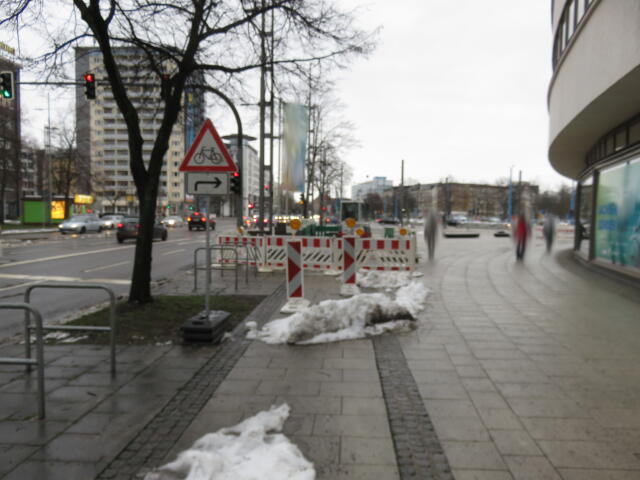 ♦ Ein Gesamtkunstwerk der Kategorie: 'Irgendwo geht's schon lang'. In Fahrtrichtung auf einmal nur noch ein Gehweg. Und irgendwo mitten durch die Absperrung soll man nach links.