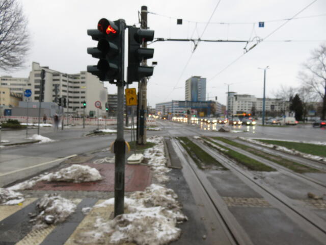 ♦ Zum Linksabbiegen soll man hier auf den Gehweg (indirektes Abbiegen). Naja. Nee.