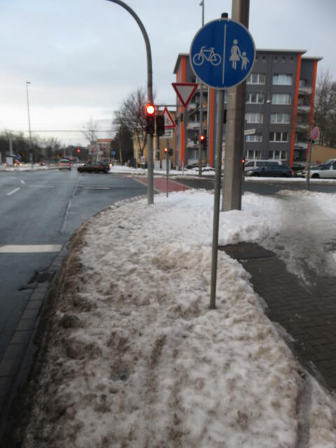 ♦ Das sieht an dem Mast schon fast so aus als hätte man den Radwegteil absichtlich nur halb geräumt.