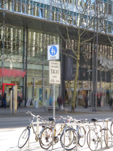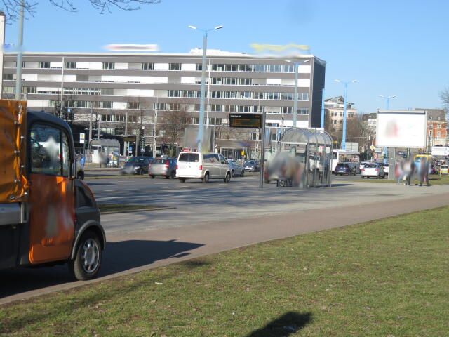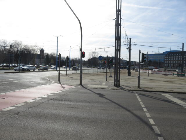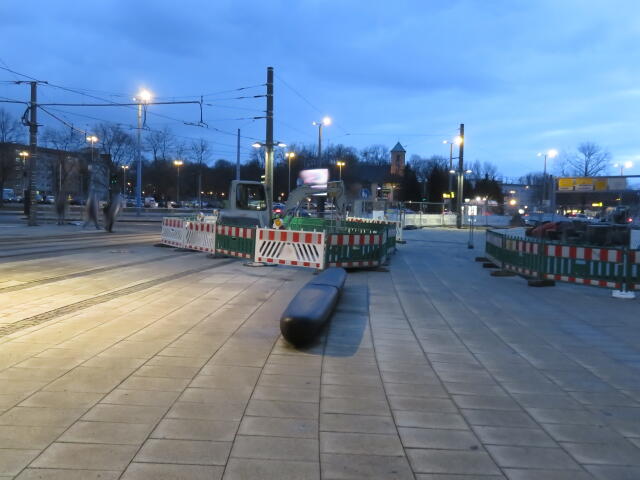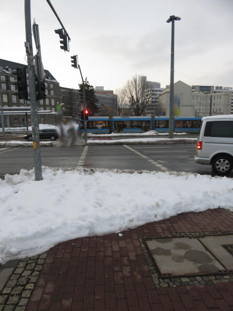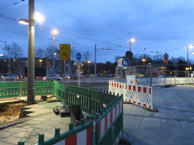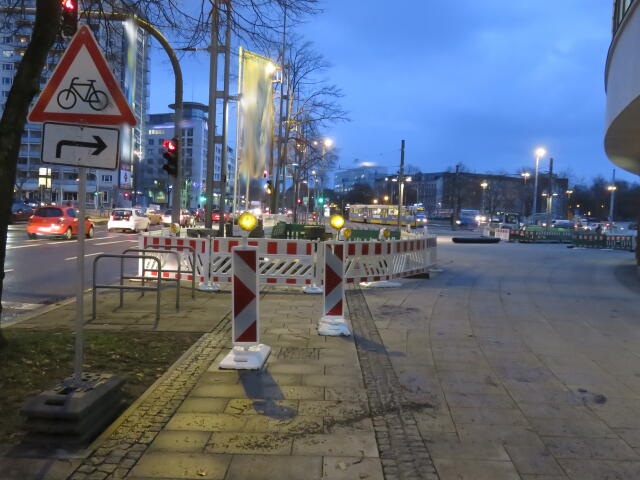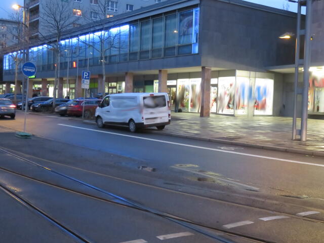 ♦ Da rechts, neben der Straßenbahn gänge es eigentlich Richtung Zenti. Aber da ist Baustelle und man müsste eigentlich nach links vor den Gleisen. Wäre schön, wenn man es wüsste.