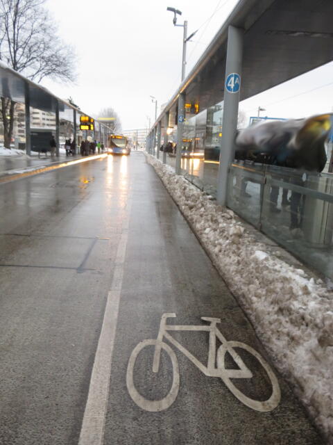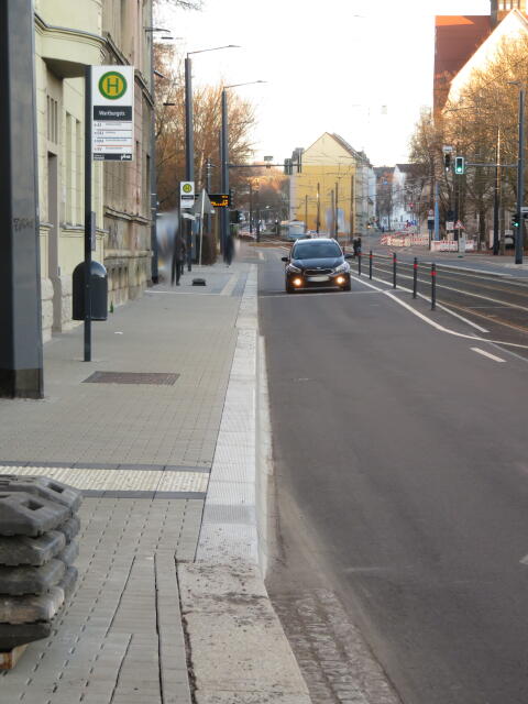 ♦ Diese Haltestelle wurde umgebaut. Und man fand es wohl clever die Fahrbahn besonders eng zu machen. Radfahrer zum Entschleunigen? Oder Autofahrer die bis zur Sattelstange auffahren, weil's zu langsam geht?