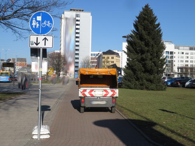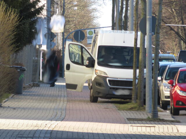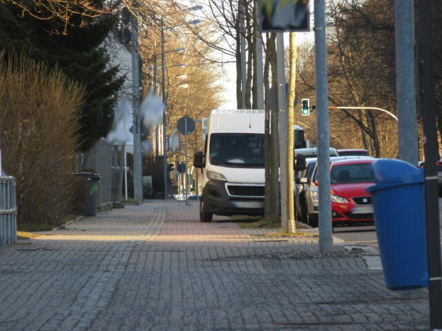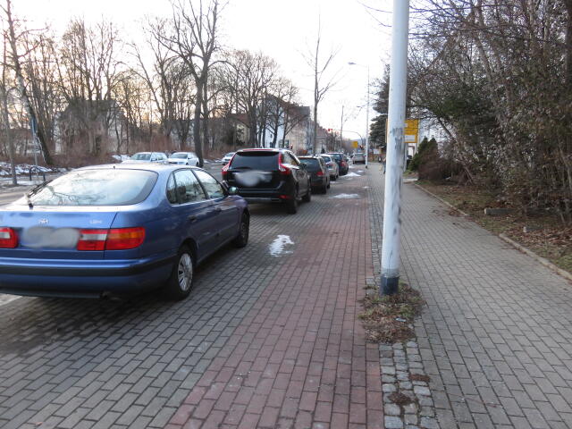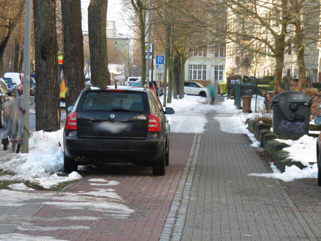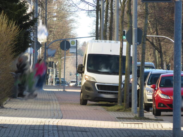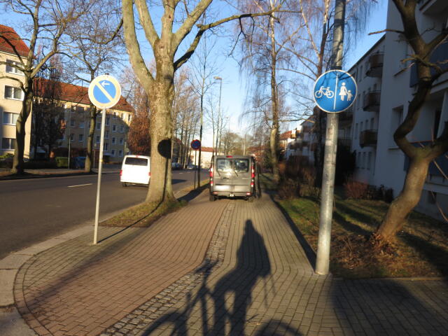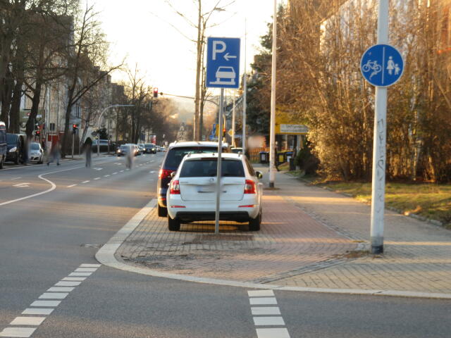 ♦ Der Gehweg ist nun ewig breit. Wenn man da schon halb drauf fährt, wieso nicht gleich ganz?