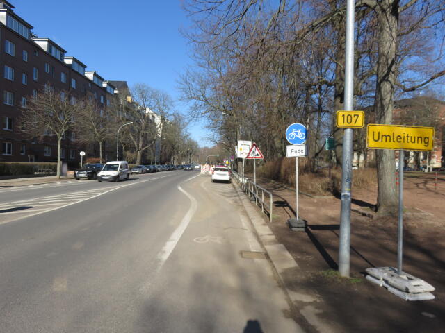 ♦ Und zwischendrin? Für beide Richtungen etwas schmal. (Und wenn man zum Falkeplatz will, muss man hier lang, weil die Kreuzung vorn nur linksseitig eine Ampel hat.)