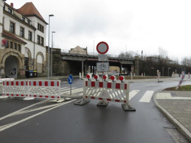 ♦ Und hier würde ein 'Radfahrer frei' sich auch gut machen. So darf man leider gar nicht gerade aus! (Und da vorn ist ja auch die Absperrung.)