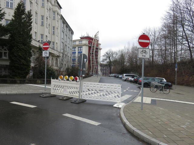 ♦ Oha. Gesperrt. Dummerweise hinter der breiten Abfahrt. Also entweder zwischen den Pollern durchfädeln oder illegal den Gehweg.